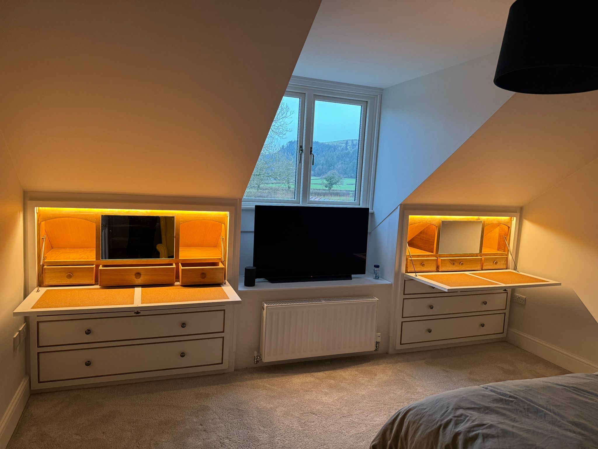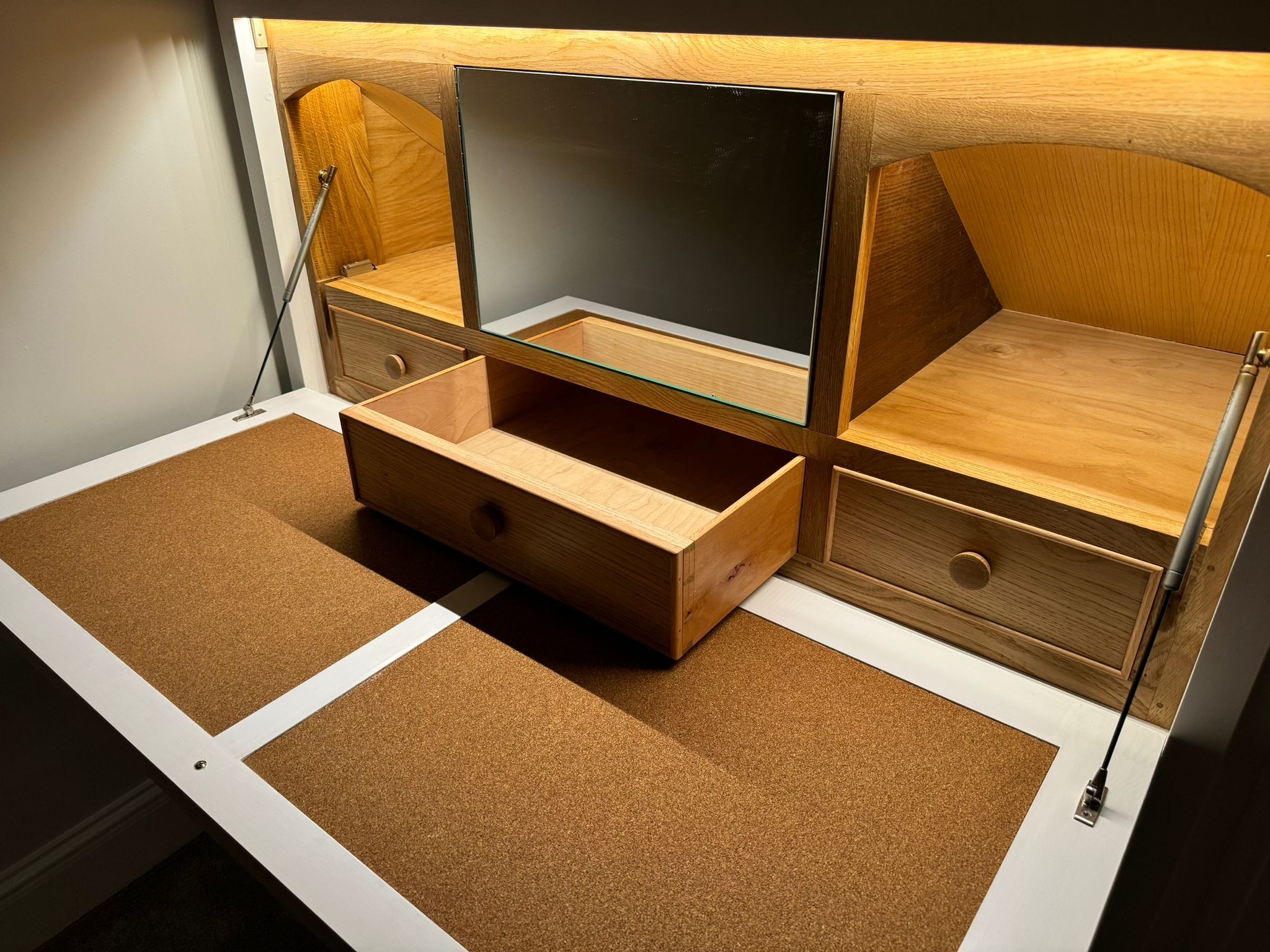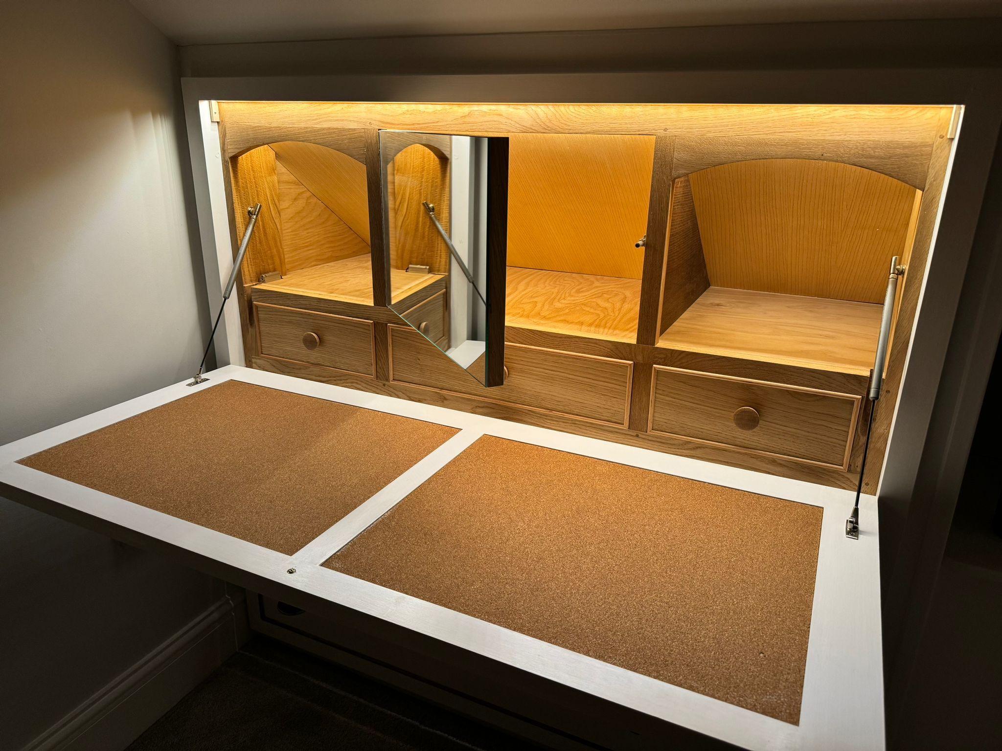 dressing tables and clothes storage Bedrooms, Furniture, Interiors Dressing table with mirror with hidden compartment, drop down table, inbuilt lighting. Made to fit into two alcoves. Small draws within and larger clothing draws beneath. Cork inlay on table and power sockets within. Painted in White. Related